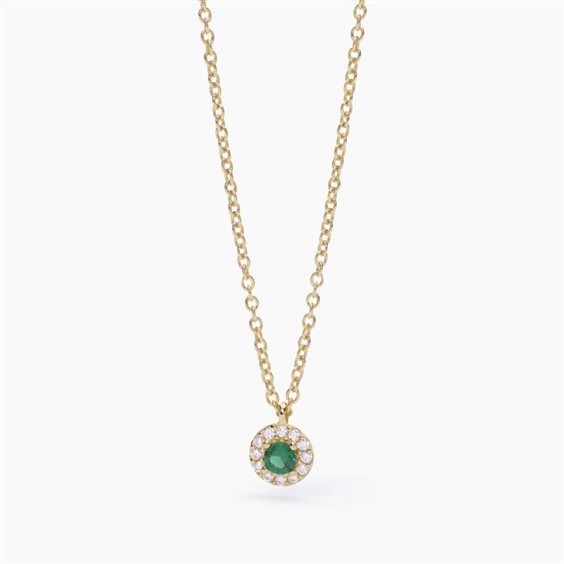 Collana in argento dorato con catena forzatina. Ciondolo rotondo con smeraldo sintetico e zirconi. • Dimensione dello smeraldo sintetico: 3.5 mm • Dimensioni degli zirconi: 1.25 mm • Chiusura con moschettone • Misura regolabile, lunghezza da 38 a 42 cm • Materiale: Argento 925 dorato, Smeraldo sintetico, Zirconi