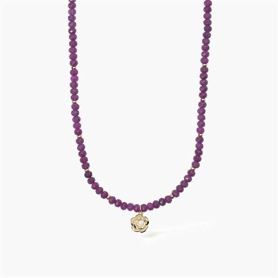 Girocollo in argento 925/°°° dorato con rubino Ø 3.5 mm, ciondolo rosa satinata con zircone bianchi Ø 1.75 mm, lunghezza regolabile da 40 a 45 cm.