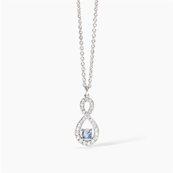 Girocollo in argento con infinito e acquamarina sintetica Girocollo regolabile da donna in argento rodiato con catena forzatina. Pendente a forma di infinito con acquamarina sintetica e zirconi bianchi. • Larghezza della catena forzatina: 1,5 mm • Dimensione del pendente: 9,5 x 18 mm • Diametro acquamarina sintetica: 4 mm • Diametro degli zirconi bianchi: 1,5 e 1,25 mm • Lunghezza regolabile da 40 a 45 cm • Materiale: Argento 925, Acquamarina sintetica, Zirconi