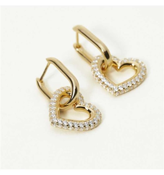Orecchini da donna realizzato in argento 925% dorato Elemento pendente a forma di cuore dalle dimensioni di 15 mm x 13,25 mm impreziosito da zirconi bianchi. Chiusura con gancio a lobo.