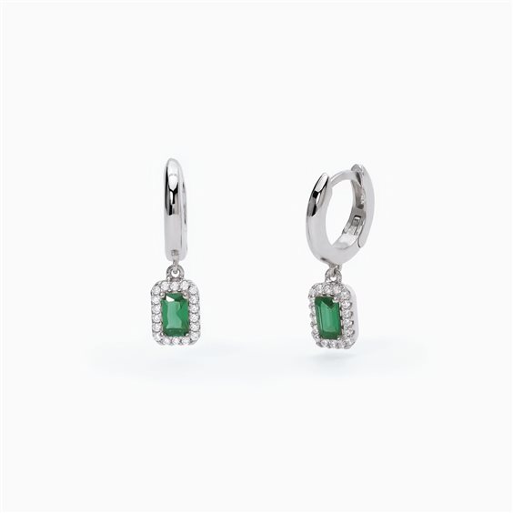 Orecchini a cerchio in argento con smeraldi sintetici pendenti taglio baguette circondati da zirconi bianchi. • Incastonatura delle pietre a griffe • Misura smeraldi: 5x3 mm • Diametro zirconi: 1.00 mm • Chiusura a scatto • Materiale: Argento 925, Smeraldi sintetici, Zirconi