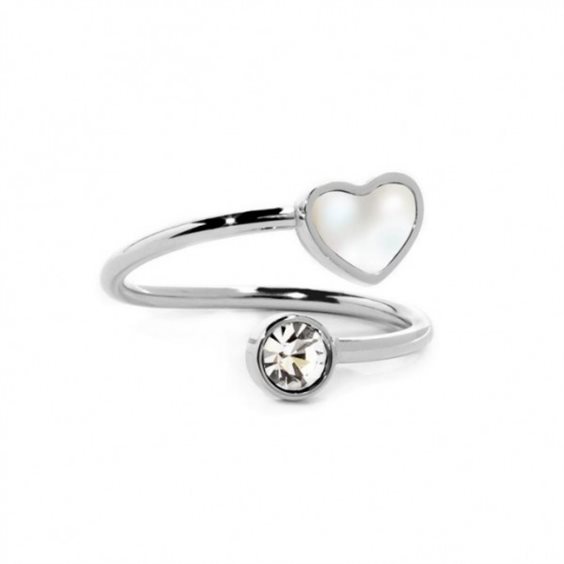 Anello acciaio con cuore con superficie frontale in madre perla e cristallo bianco