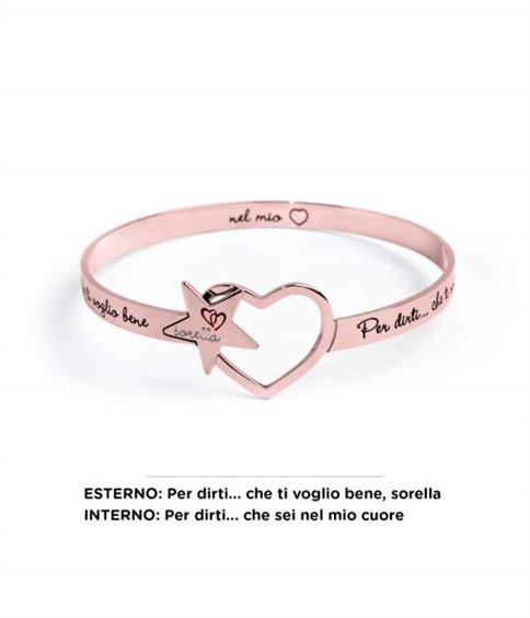 Bracciale rigido acciaio Ip rosé con stella e frase dedicata alla sorella 'Per dirti...che ti voglio bene' Collezione : Nel Mio Cuore 12 Materiale : acciaio, Ip rosè, smalto nero, bianco e rosso