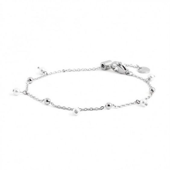 Bracciale in acciaio con catena con sfere in acciaio alternate a perle pendenti con diametro 3.30 mm. Lunghezza totale 19 cm regolabile da 19 cm a 14 cm tramite cursore