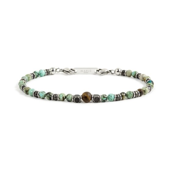 Bracciale in acciaio con pietra verde turcheseafricano 4 mm ed elementi in acciaio,ematite e acciaio brunito con al centro pietra occhio di tigre 6 mm. Lunghezza bracciale regolabile 19/21 cm. Tag Marlù removibile Collezione Man 02 Materiali : acci