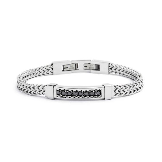 Bracciale in acciaio con catena a spina di pesce con spessore 6,1 mm, centrale a triplo filo con catena tennis con cubic zirconia neri e con catena grumetta sui lati. Lunghezza totale 21 cm, regolabile da 21 a 19,5 cm tramite chiusura a scatto removibile