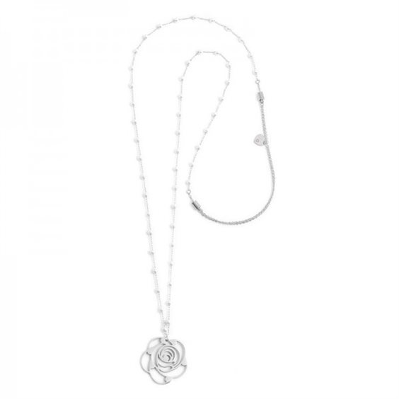 Collana in acciaio con catena con perle con al centro un pendente a forma di rosa traforata con sopra cristalli bianchi. Lunghezza totale 90 cm regolabile tramite doppio cursore da 90 cm a 76 cm.