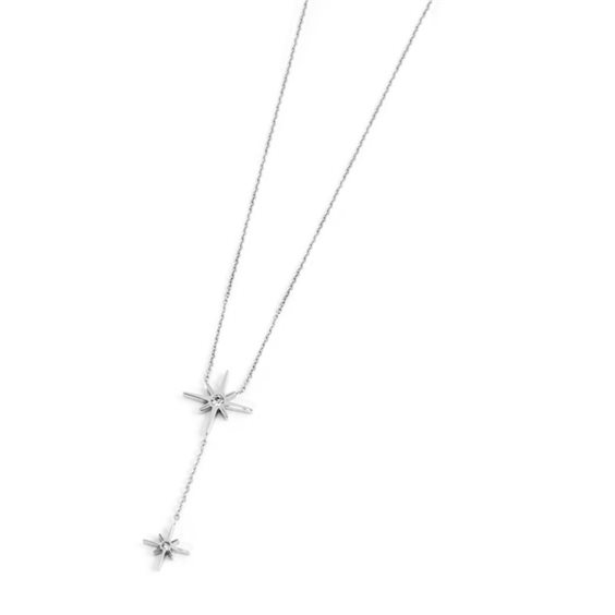 Collana Y in acciaio con catena cross e con 2 pendenti a forma di rosa dei venti: il primo con cristallo bianco al centro, la cui parte posteriore presenta al centro il simbolo della rosa dei venti incisa e sulle punte più lunghe sono incise le parol
