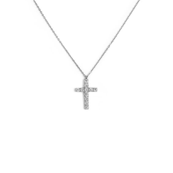 Collana in acciaio con croce pendente 1,7*2,6 cm con cubic zirconia bianchi. Lunghezza totale 50 cm, regolabile tramite cursore