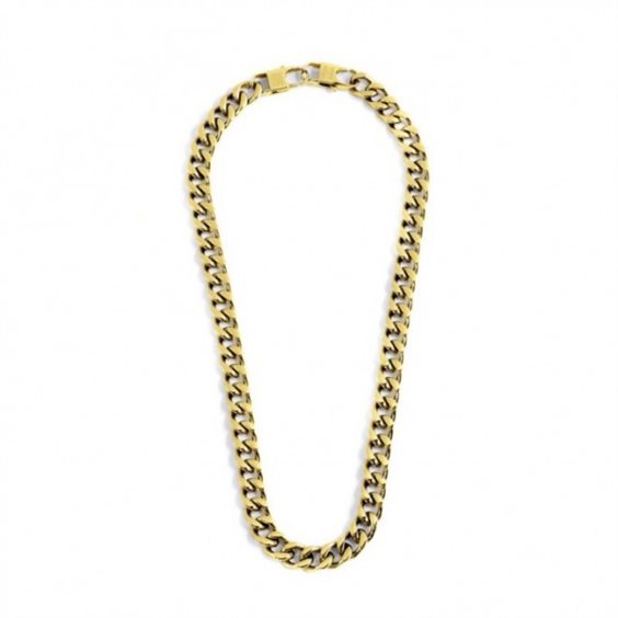 Catena in acciaio con pvd oro maglia grumetta piatta, grandezza maglia 10 mm, con doppio moschettone con texture bugnata e logo Marlù inciso