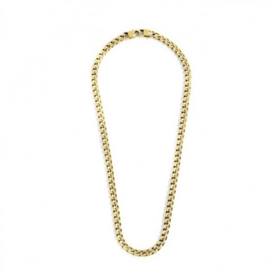 Catena in acciaio con pvd oro maglia grumetta piatta, grandezza maglia 6 mm, con doppio moschettone con texture bugnata e logo Marlù inciso