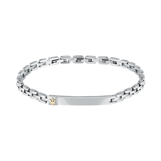 Braccialetto da uomo realizzato in acciaio anallergico. Targa centrale incidibile con logo dorato. Misura regolabile; chiusura con maglie rimovibili.