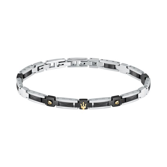 Bracciale Maserati in acciaio inserti in ceramica nera dettagli e logo in pvd oro giallo Lunghezza regolabile da 18 cm a 21,5 cm